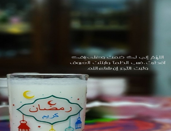 - يوجد بعض الأدعية التي يستحب قولها في مواعيد محددة، وهذا الدعاء الموضح في الصورة يقال في موعد الإفطار، والعيران من المشاريب الجميلة التي تروي عطش الصائم، وعبارة رمضان كريم عليه لتعبر عن وقته.