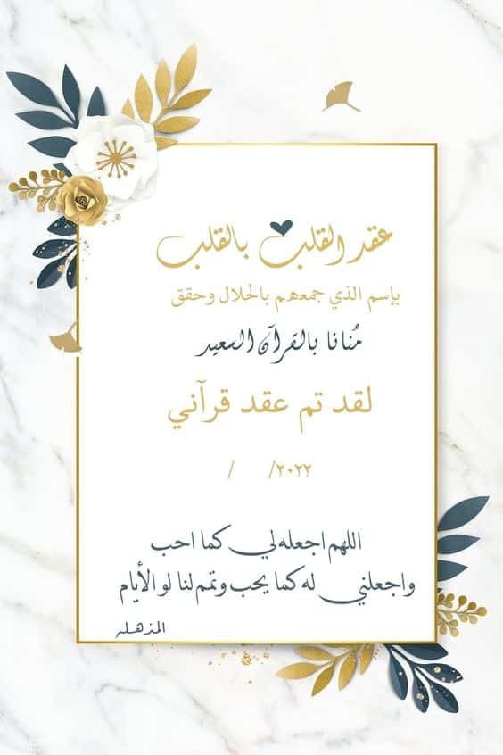 - باسم الذي جمعنا بالحلال، وحقق منانا بعقد القران السعيد، نعلن يوم (…) الموافق (…) عيد سعادتنا، ننتظركم في تمام الساعة (…) لتكتمل سعادتنا بوجودكم.
