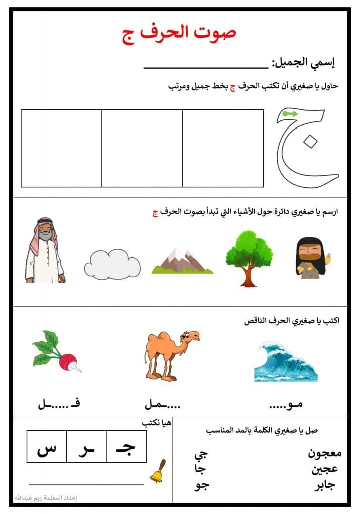 الجيم (ج) هو خامس حروف الأبجدية العربية، وقيمتها 3 في حساب الجمل، فيما يلي تدريبات على حرف الجيم تساعد أطفالكم على إتقان حرف الجيم قراءة و كتابة: