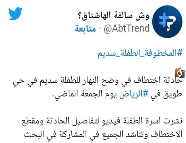 بتاريخ 10 / 2 / 2023 م،انتشر بصورة كبيرة وسريعة جدًا خبر خطف الطفلة السعودية “سديم”، حينها تم عمل هاشتاج ثابت صار الكل يتداوله ويقوم بنشره عبر صفحته الشخصية لمحاولة الوصول إلى الطفلة “سديم”.