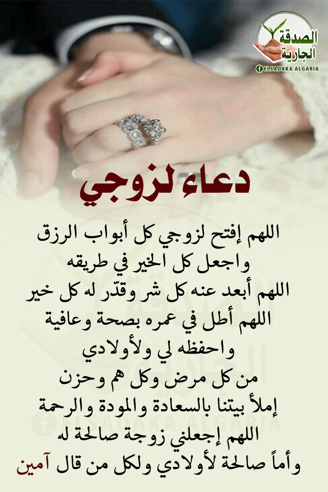 - اللهم إني ادعوك بكرمك وجودك أن تحفظ لى زوجي وترزقه الصحة والعافية وان تجعل الرزق له ميسر حلالا طيبا وان تجعل تعبه من اجلنا في ميزان حسناته ربى إني أحببته ولا أري لدنيا جمال بدونه فادعوك أن لا تحرمني منه وتجعله بجواري سنوات لا تعد بحب وإخلاص ومودة و رحمة.