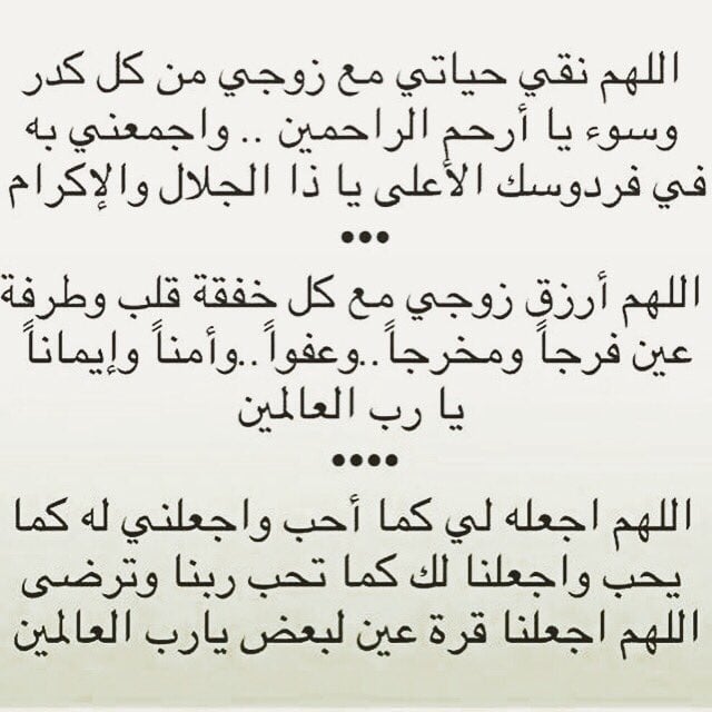 - اللهم انك تعلم ما في قلبي ونقاء سريرتي فنقي حياتي مع زوجي من كل كدر وسوء يا أرحم الراحمين واجمعني به في فردوسك الأعلى يا ذا الجلال والإكرام.