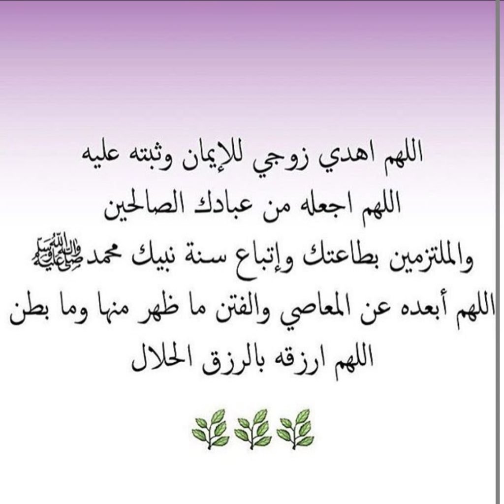 - اللهم اصلح زوجي، اللهم وثبته على الأيمان اللهم اجعله رجلاً مؤمن صادقاً صدوقاً جواد كريما، اللهم وزده حباً لي وصراحة معي تعلقاً بي، اللهم مد بعمره على زود عمل صالح.