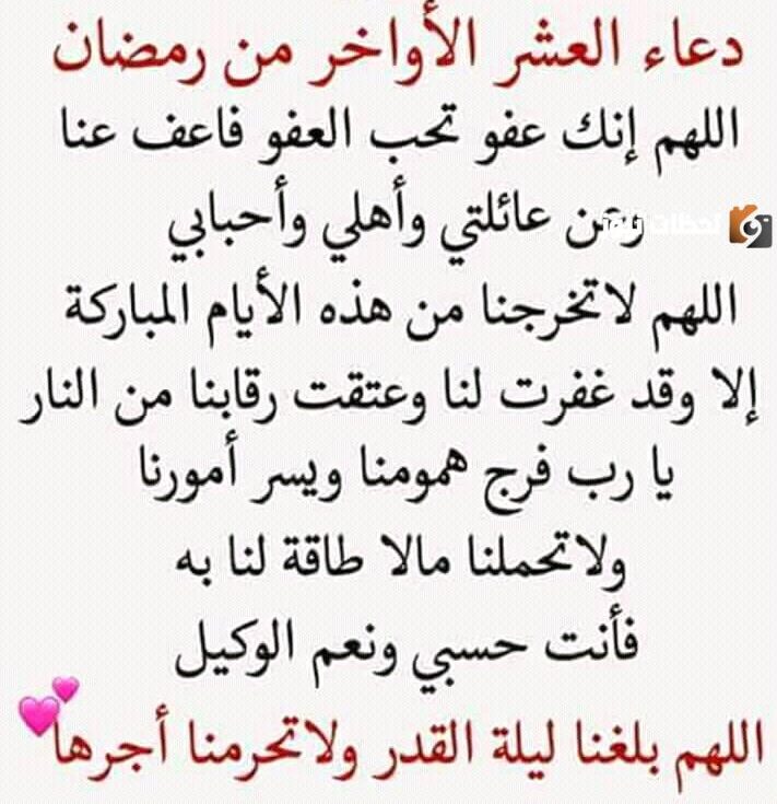 - اللهم اجعلنا في هذه الليالي من الذين نظرت إليهم وغفرت لهم ورضيت عنهم، اللّهم تقبل صيامنا، وقيامنا، وصلاتنا، ودعائنا، وسائر أعمالنا يا أرحم الراحمين.