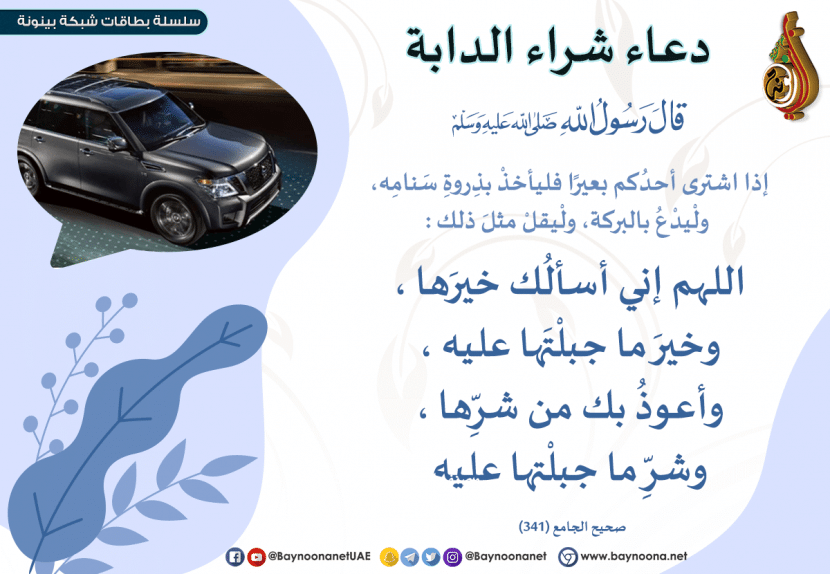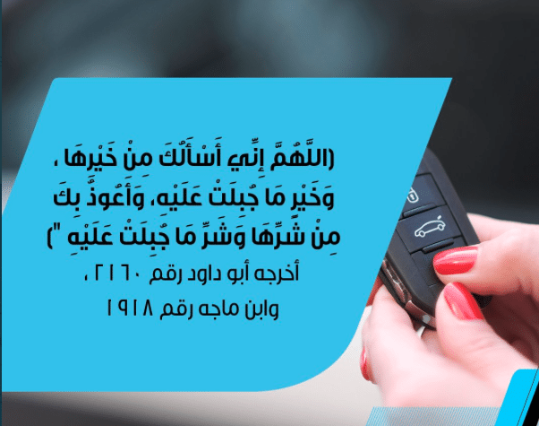 - عند شراء السيارة الجديدة قُل: ” اللهم لكـ الحمـد أنت يسرت لي امتلاكـ هذه السيـارة أسألك خيرها وخير مـا صنعت له وأعوذ بكـ من شرها وشر مـا صنعت له.
