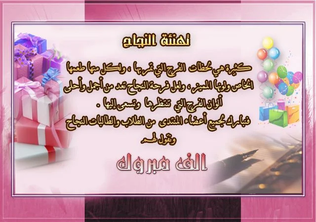 - ألف مبروك على هذا التفوق المشرف! نحتفل بك اليوم ونفخر بما حققته. استمر في السعي لتحقيق المزيد من النجاحات.