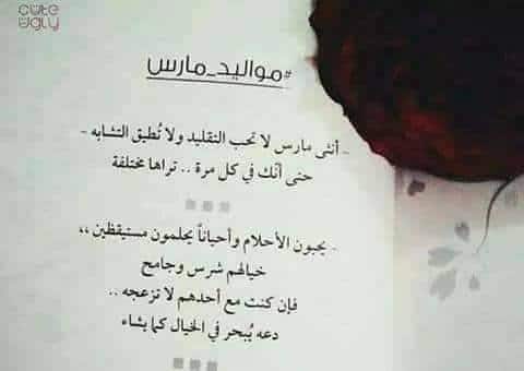 - في إحدى ساعات هذا اليوم، وهذا الشهر شهر مارس وعام ليس كهذا العام إطلاقا ولد “صلة القرابة” “الاسم” كل سنه وانت طيب يا احلا من انولد في مارس ربي ينبتك نبات حساً ويصلحك ويبر اهلك فيك، عيد ميلاد سعيد.