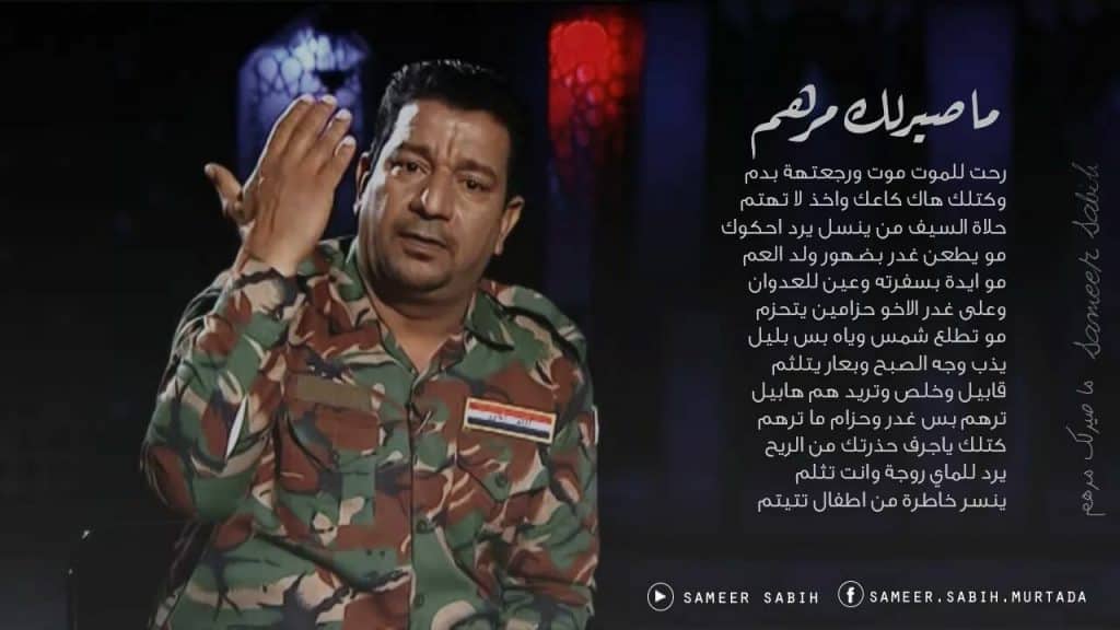بقينة على الجبل رمايت سهامونزلت غيرنة تلم الغنايمنصبر عالعطش ما نحفر البيربس نحفر متر تطلع جماجممن الكاروك غير يمر بالاعراسبوجهة يروح لآحضان المأتم