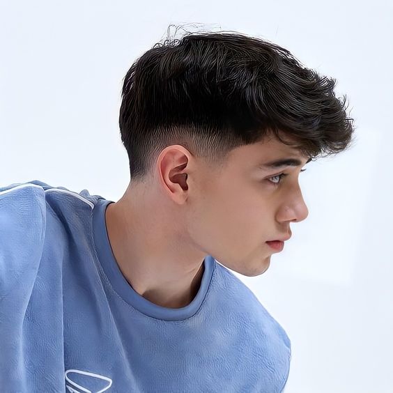 - شعر الفتى مدرج بأناقة على الجوانب، مع تصفيفه للأمام بشكل رائع، مما يمنحه مظهرًا عصريًا وجذابًا.