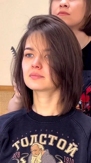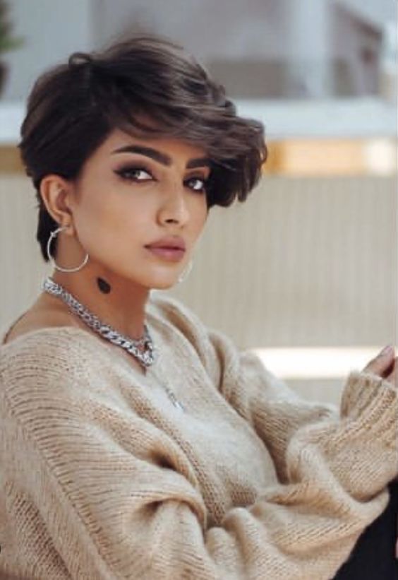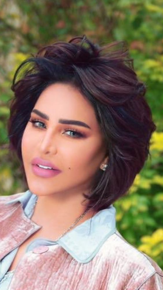 - شعر الفتاة قصير وينزل بشكل جميل على جبهتها بطريقة تجعله جذابًا ومتساويًا تمامًا، مما يعطيها مظهرًا فريدًا وأنيقًا.