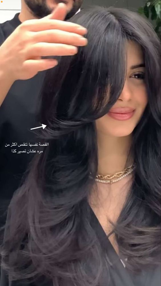 - قصة شعر الفتاة مصفف إلى الأمام بشكل رائع، حيث ينزل الشعر قليلاً على وجهها بأناقة، مع تخفيف من الخلف، هذا التصميم يعزز جاذبيتها ويمنحها مظهرًا عصريًا.
