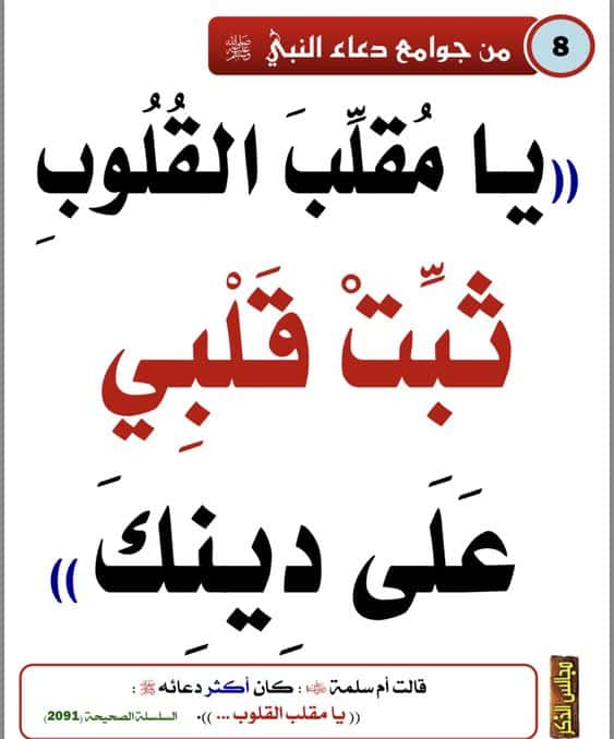 - (اللَّهُمَّ أَصْلِحْ لي دِينِي الذي هو عِصْمَةُ أَمْرِي، وَأَصْلِحْ لي دُنْيَايَ الَّتي فِيهَا معاشِي، وَأَصْلِحْ لي آخِرَتي الَّتي فِيهَا معادِي، وَاجْعَلِ الحَيَاةَ زِيَادَةً لي في كُلِّ خَيْرٍ، وَاجْعَلِ المَوْتَ رَاحَةً لي مِن كُلِّ شَرٍّ).