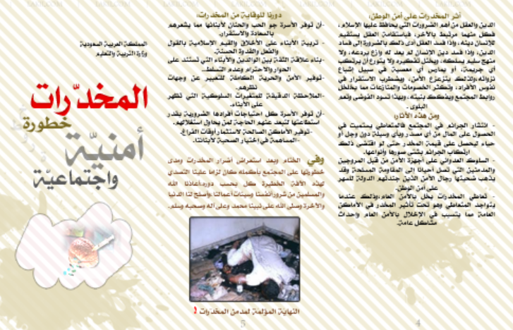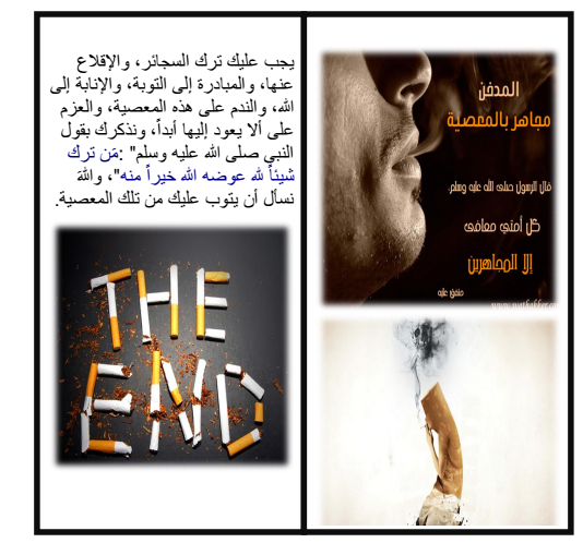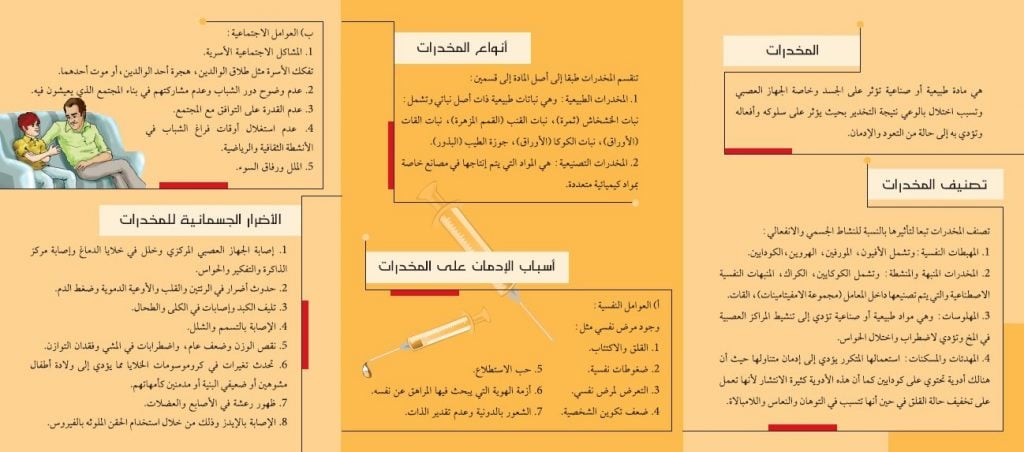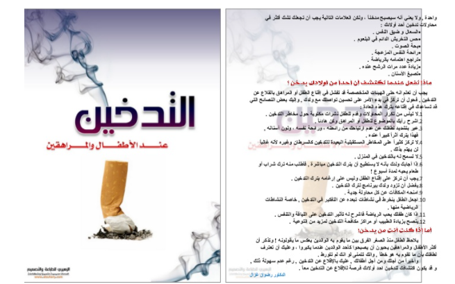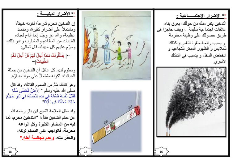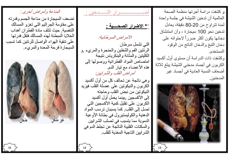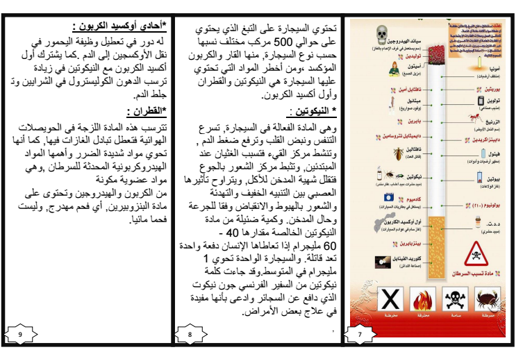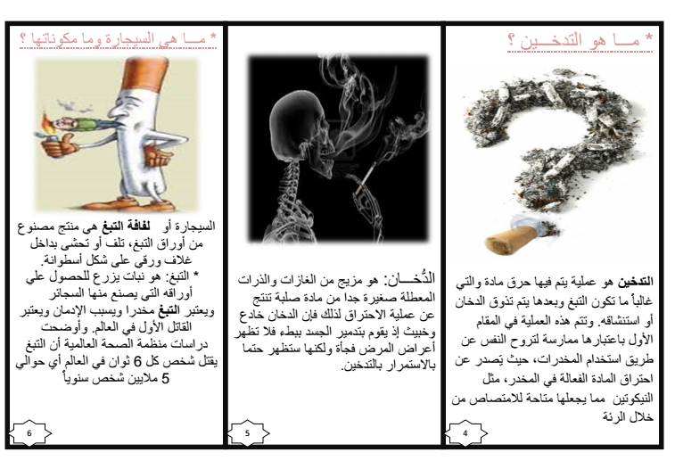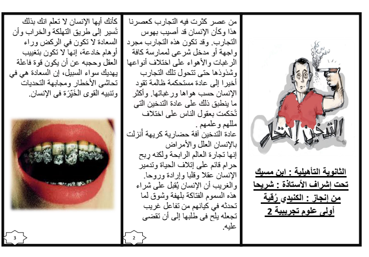 إليكم في هذه الفقرة مطوية عن التدخين والمخدرات وهي واحدة من بين أكثر الأشياء التي تؤدي لتدمير الجسم وإدمان المخدرات مضر جدا للجسم البشري حيث يسبب له العديد من الأمراض، كما تدخل المخدرات أيضا في بعض العقاقير الطبية من أجل تخفيف الألم على المصابين خاصة في الأمراض الخطيرة أو الإصابات الكبيرة، والمخدرات من الممكن أن تجدها في عدة صور والتي من بينها الكحوليات والكوكايين وغيرها من الأشكال المختلفة.