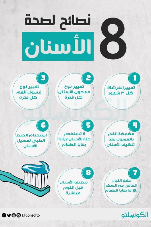- حافظ على سلامة أسنانك بتنظيفها بالفرشاة ومعجون الأسنان الذي يحتوي على مادة الفلورايد.