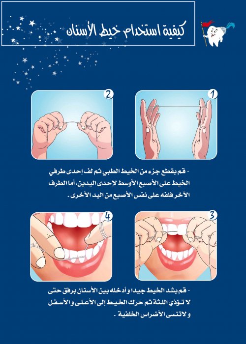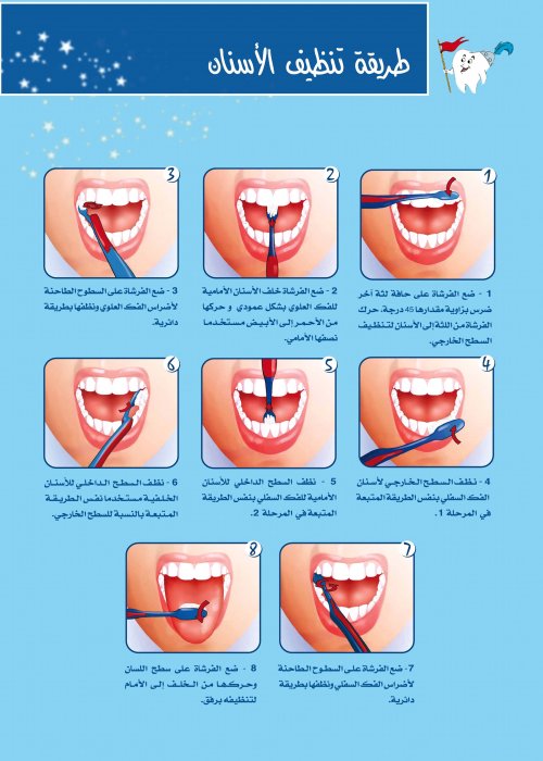 - يجب أن ينظف الجميع أسنانهم بالفرشاة مرتين يوميا على الأقل، والأفضل تنظيف الأسنان 3مرات يوميا أو بعد كل وجبة، كما يجب استخدام خيط تنظيف الأسنان مرة يوميا على الأقل.