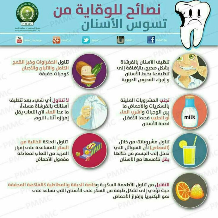 - شرب الحليب بكثرة لأنه أهم مصادر الكالسيوم والفوسفور، وهذان المصدران مهمان لصحة الأسنان