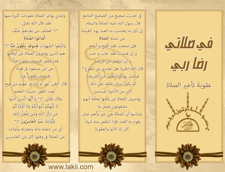 مطوية عن الصلاة جاهزة للطباعة وورد حيث أن الصلاة هي الركن الثاني من أركان الإسلام الخمسة و تعتبر الصلاة عمود الدين و التي لا يصح إسلام المرء إلا بأدائها و لهذا فإن عمل مطوية عن الصلاة وورد سوف يكون أمر بالغ الأهمية لتعريف الأشخاص بأهمية الصلاة و فضلها، و لهذا فإن موضوع هذه الفقرة سوف يكون حول مطوية عن الصلاة جاهزة للطباعة وورد.